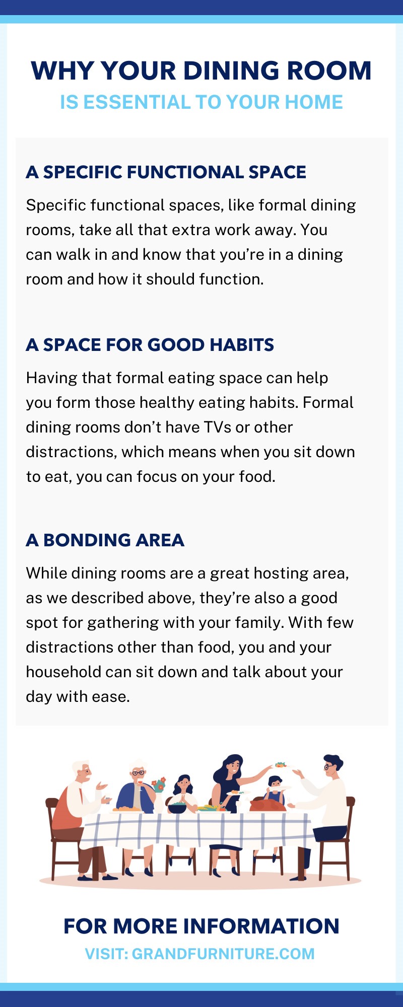 Having that formal eating space can help you form those healthy eating habits. Formal dining rooms don’t have TVs or other distractions, which means when you sit down to eat, you can focus on your food. This allows you to pay better attention to your body’s hunger queues and can help little ones develop good table manners. Dining rooms are essential to your home and health.